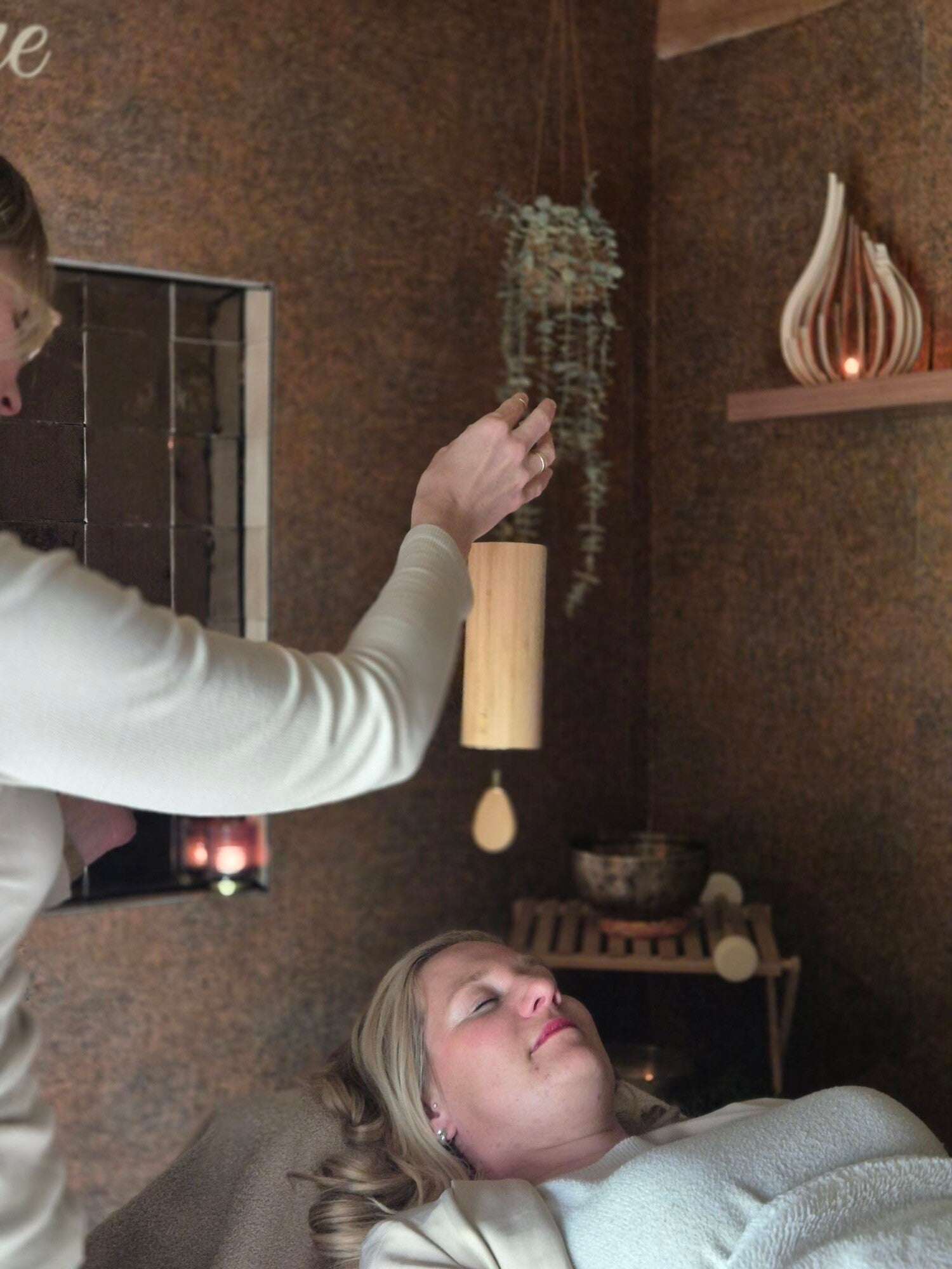 Aan het einde van de sessie sluit ik vaak af met een koshi (windgong) en een zachte afstrijk, zodat alles rustig kan landen. We ronden af met een kort nagesprek om je ervaring te delen en eventuele vragen te bespreken.